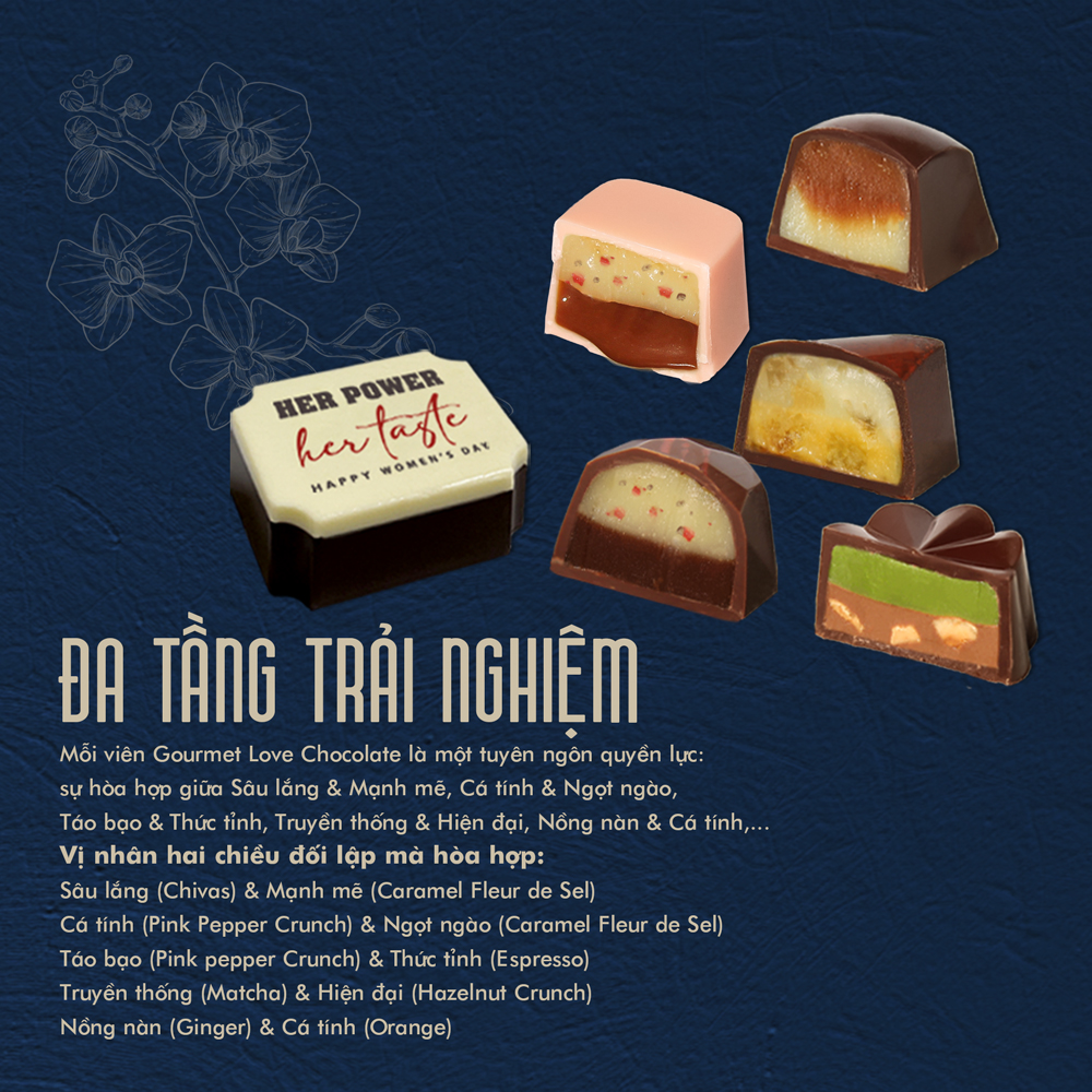 Gourmet Love Chocolate không đơn thuần là socola, mà là một bản hòa tấu vị giác. Từng viên là một chương trong cuốn sách kể về người phụ nữ: mềm – giòn, trầm – sáng, sâu – bừng, tất cả cùng tồn tại và tôn lên nhau. Hộp quà được thiết kế trang nhã với các tone pastel nhẹ nhàng, gói trọn cảm xúc mà bạn muốn trao đi. Không cần phải nói quá nhiều – chỉ cần trao đúng một viên, là đủ.