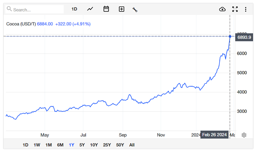 Sản lượng cacao của Ghana dự kiến sẽ thấp nhất trong 13 năm qua, và của Bờ Biển Ngà sẽ là thấp nhất trong vòng 7 năm qua, dựa trên số liệu được cung cấp bởi các nhà xuất khẩu. Hai quốc gia này cung cấp khoảng 60% số hạt cacao trên thế giới (theo Tổ chức Cacao Quốc tế). Các hợp đồng mua tương lai có khối lượng giao dịch lớn nhất đang giao dịch ở mức cao nhất kể từ năm 1977 ở New York, vượt xa qua mức 4.200USD/tấn. Ở mức giá đó, bạn có thể mua khoảng 50 thùng dầu. "Đây là một cú tăng giá khủng khiếp, và nó chưa đạt đến đỉnh điểm" - Fuad Mohammed Abubakar, giám đốc Công ty Ghana Cocoa Marketing Co. Ltd. (UK) - "Có rất nhiều rủi ro lớn hơn đang chờ đợi phía trước". Với giá Đường cũng đạt đến mức cao nhất trong thập kỷ, người tiêu dùng có khả năng sẽ phải chi trả nhiều hơn cho thanh sô cô la, bánh quy và cacao nóng. Bộ Nông nghiệp Hoa Kỳ dự đoán giá đường và đồ ngọt sẽ tăng 8.9% trong năm nay và thêm 5.6% vào năm sau, vượt qua mức lạm phát thực phẩm tổng cộng.