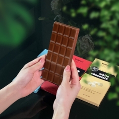 - Socola dạng thanh 100g/ 45g được bọc trong lớp giấy bạc cao cấp, bên ngoài là hộp giấy Ivory trang nhã, giúp bảo vệ khỏi ánh sáng, ổn định cấu trúc, ngăn hấp thụ mùi từ môi trường và giữ trọn hương vị nguyên bản