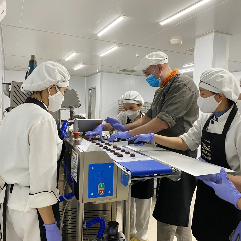 Được làm từ nguyên liệu couverture chocolate 5 sao hảo hạng, 100% bơ cacao nguyên chất, Dark Couverture Chocolate 58%, đắng nhẹ và ít ngọt, nhân Almond (Hạnh nhân).