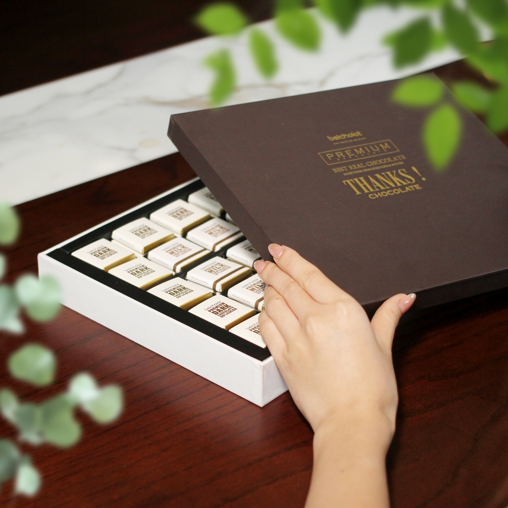 "Thanks Chocolate S245" đã làm nổi bật tối đa phong cách đơn giản mà sang trọng. Bắt đầu với thông điệp ngắn gọn nhưng sâu sắc, "Thanks" với font chữ Serif có chân - luôn được xem là kiểu font kinh điển dành cho những sản phẩm cao cấp bậc nhất vì sự thanh lịch và sang trọng của nó. Màu sắc hài hoà từ ánh vàng của logo tới nắp vỏ nâu trầm mềm mịn từ giấy mỹ thuật cao cấp - màu của sự vững bền và chắc chắn. Bên trong hộp, từng viên Caraque Socola vuông vắn được gói ghém và sắp xếp cẩn thận, tuân thủ chặt chẽ quy định vệ sinh an toàn thực phẩm. Với thành phần làm từ 100% bơ cacao nguyên chất nhập khẩu từ Bỉ, bạn sẽ hoàn toàn bị quyến rũ bởi sự tan chảy mềm mịn ngay trên đầu lưỡi, hít thật sâu hương vị tuyệt hảo của sản phẩm socola cao cấp và hoà mình vào "vũ điệu" cacao bất tận. "Thanks Chocolate" chắc chắn là sản phẩm để thay bạn truyền tải thông điệp biết ơn và trân trọng những điều đang có.