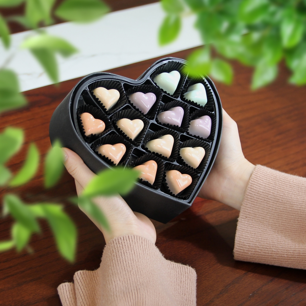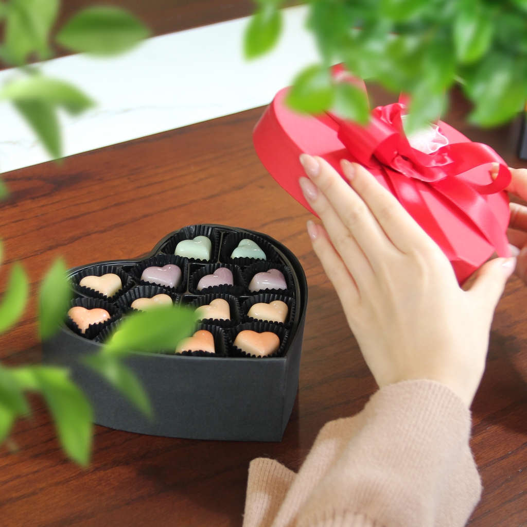 - Whisper of Love chocolate/ S02 được đóng trong hộp giấy mỹ thuật hình trái tim kèm nơ xinh xắn, chứa 13 trái tim socola với nhiều phiên bản trang trí thanh lịch. Từng viên socola là một nhịp rung dịu êm… dành cho người đang mang đến những xao động trong trái tim bạn.