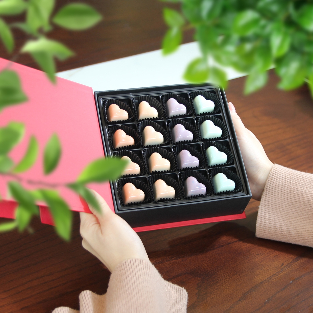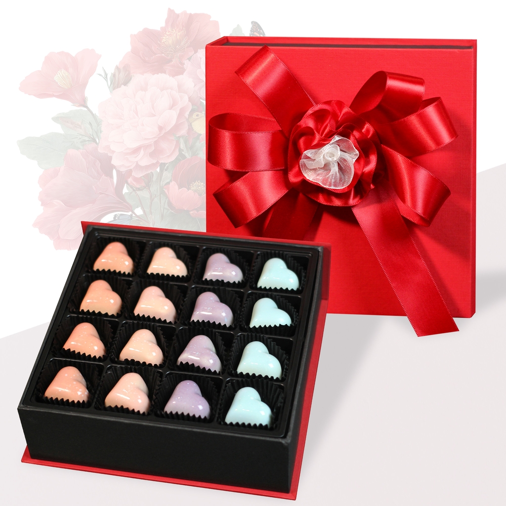 - Whisper of Love chocolate/ S04 được đóng trong hộp giấy mỹ thuật hình trái tim kèm nơ xinh xắn, chứa 16 trái tim socola với nhiều phiên bản trang trí phong phú, thanh lịch và sang trọng. Chỉ một hộp Socola nhưng chứa đựng cả một trái tim đang yêu, trọn vẹn, âm thầm, đầy tinh tế.