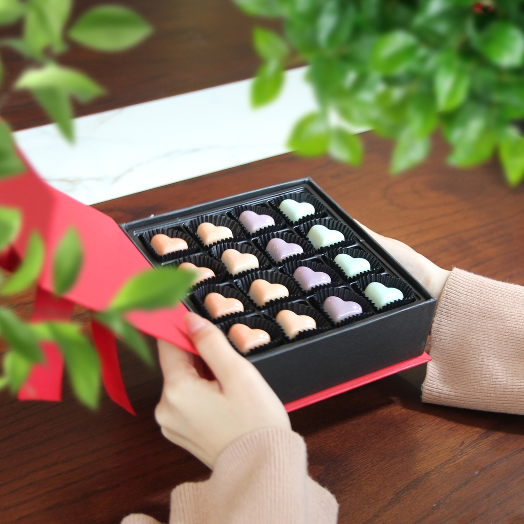 - Lấy cảm hứng từ những xúc cảm ngọt ngào và tinh khôi nhất, Whisper of Love là bộ sưu tập socola trái tim được chế tác từ socola đen Antcholat với nghệ thuật trang trí màu pastel thanh lịch: tím dịu, hồng phấn, xanh ngọc. Mỗi viên chocolate như một lời yêu nhẹ nhàng, không phô trương, chỉ âm thầm chạm đến trái tim người nhận. Điểm đặc biệt nằm ở cách tạo màu- Belcholat sử dụng màu thực phẩm cao cấp từ Chocolate World (Bỉ), chỉ một lượng rất nhỏ đủ để tạo nên những gam màu nhẹ như lời thì thầm, an toàn cho sức khỏe và quan trọng nhất đẹp một cách tinh tế, như chính người gửi trao